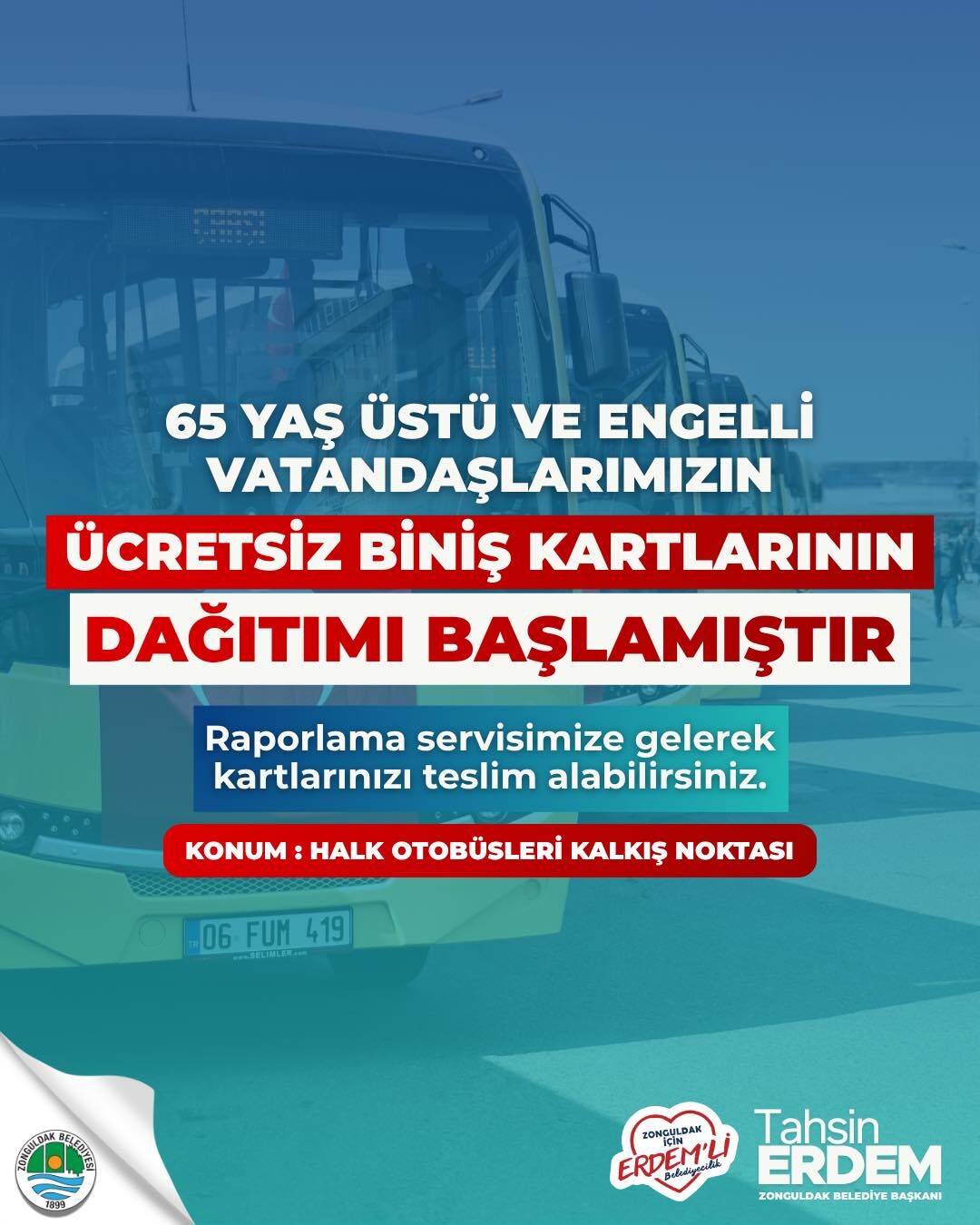 Zonguldak Belediyesi, 65 yaş üstü ve engelli vatandaşlara yönelik halk otobüsleri ücretsiz biniş kartlarının dağıtımına başladığını duyurdu.