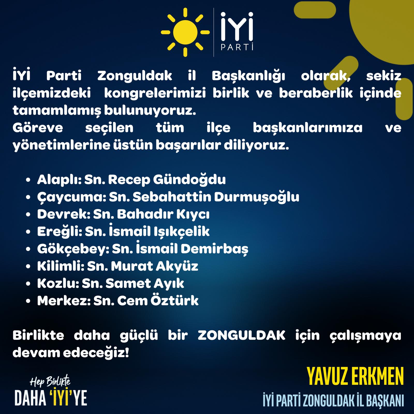İyi Parti Zonguldak İl Başkanı Yavuz Erkmen, kongreler sonrası yaptığı açıklamada; "Birlik ve beraberlik içerisinde kongrelerimizi tamamladık. Göreve seçilen tüm ilçe başkanlarımıza ve yönetimlerine üstün başarılar diliyorum. Birlikte daha güçlü bir Zonguldak için çalışmaya devam edeceğiz." dedi.