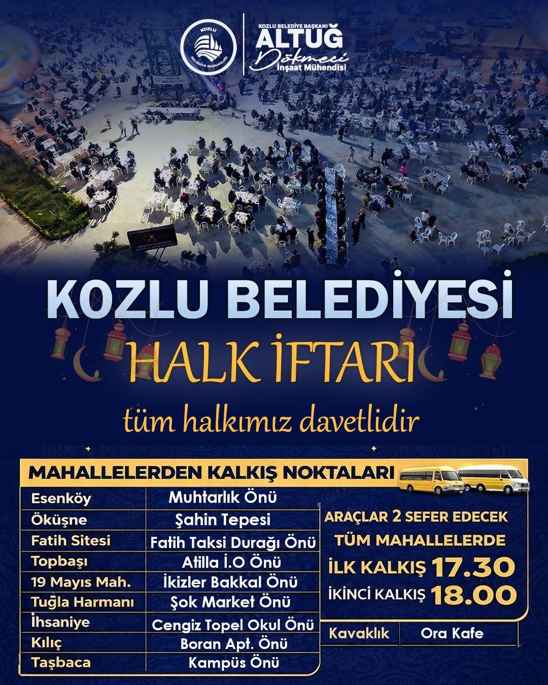 İftar programına katılım sağlamak isteyen vatandaşlar için ilçenin farklı noktalarından servis araçları kaldırılacak. Araç kalkış noktaları şu şekilde açıklandı: