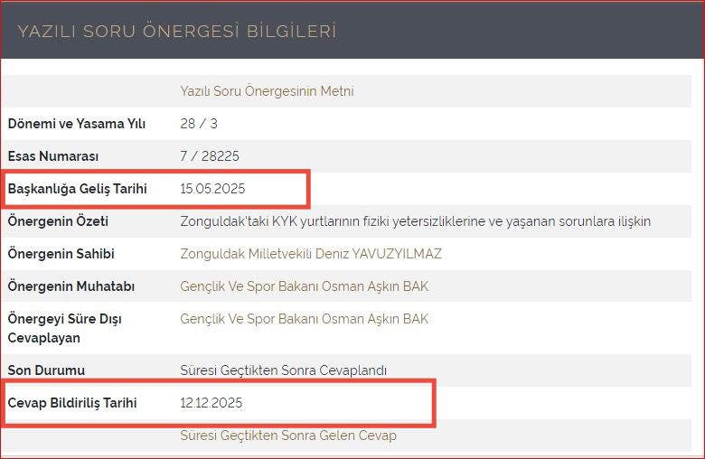 Zonguldak’taki KYK yurtlarında yaşanan yemek, hijyen ve barınma sorunlarına ilişkin CHP Genel Başkan Yardımcısı ve Zonguldak Milletvekili Deniz Yavuzyılmaz’ın verdiği soru önergesine, Gençlik ve Spor Bakanlığı yanıt verdi. Ancak Bakan Osman Aşkın Bak tarafından aylar sonra verilen yanıtında, Zonguldak’ta Üniversite öğrencilerin yaşadığı barınma sorunlarının nedenini açıklamak yerine, sorumluluğu örtmeye yönelik genel ifadeler dikkat çekti.