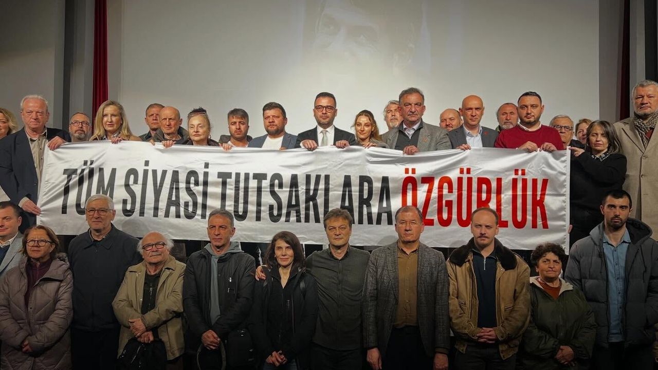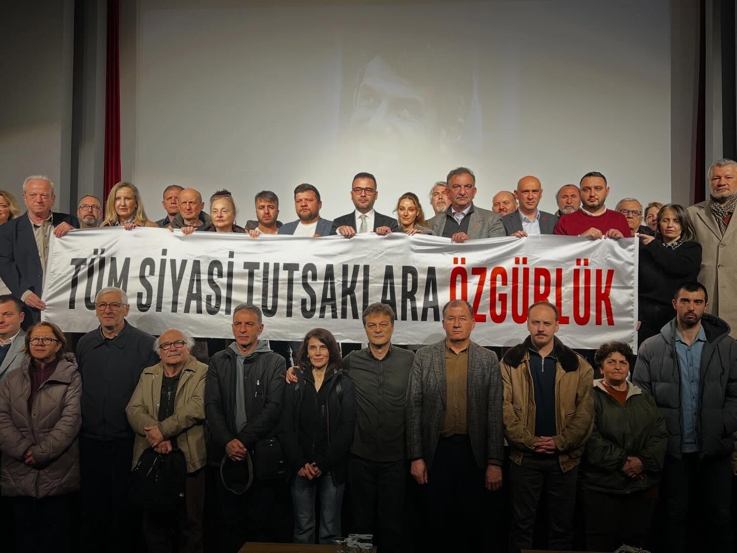 Gösterim sonrası sahnede bir araya gelen katılımcılar, “Tüm siyasi tutsaklara özgürlük” yazılı pankart açarak dikkat çeken bir mesaj verdi.