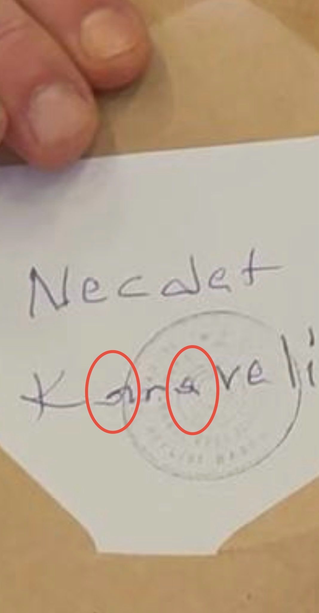 Harf hatası olan ve geçersiz olması gereken AKP oylarına 3 örnek; Birinci fotoğrafta: Karaveli’nin ilk ‘a’sı hatalı, 2. fotoğrafta Necdet yerine Nejdet yazılmış 3. Fotoğrafta ise Karaveli yerine Karavesi yazılmış.