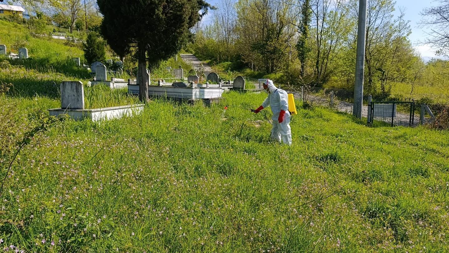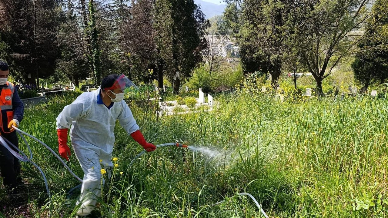 Gökçebey Belediyesi, ilçe genelindeki mezarlıklarda yabani ot ve dikenlere karşı ilaçlama çalışmalarını sürdürüyor.