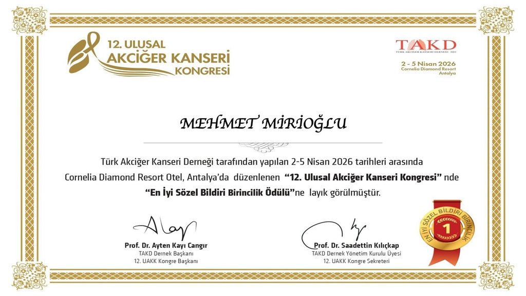 Zonguldak Bülent Ecevit Üniversitesi (BEUN) Tıp Fakültesi Radyasyon Onkolojisi Ana Bilim Dalı akademisyenlerinden Arş. Gör. Dr. Mehmet Mirioğlu, 12. Ulusal Akciğer Kanseri Kongresi’nde önemli bir başarıya imza attı. Danışmanlığını BEUN Tıp Fakültesi öğretim üyesi Doç. Dr. Özlem Elmas’ın yürüttüğü çalışma “En İyi Sözel Bildiri Birincilik Ödülü”ne layık görüldü.