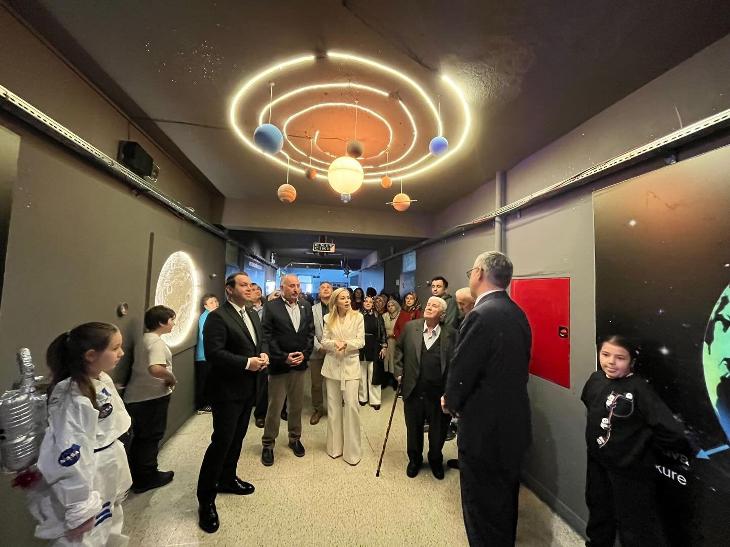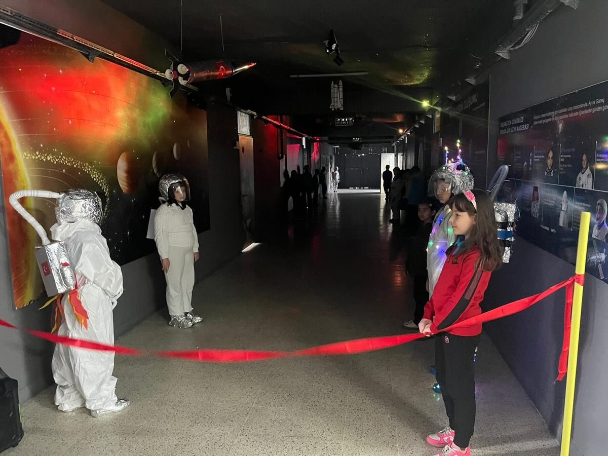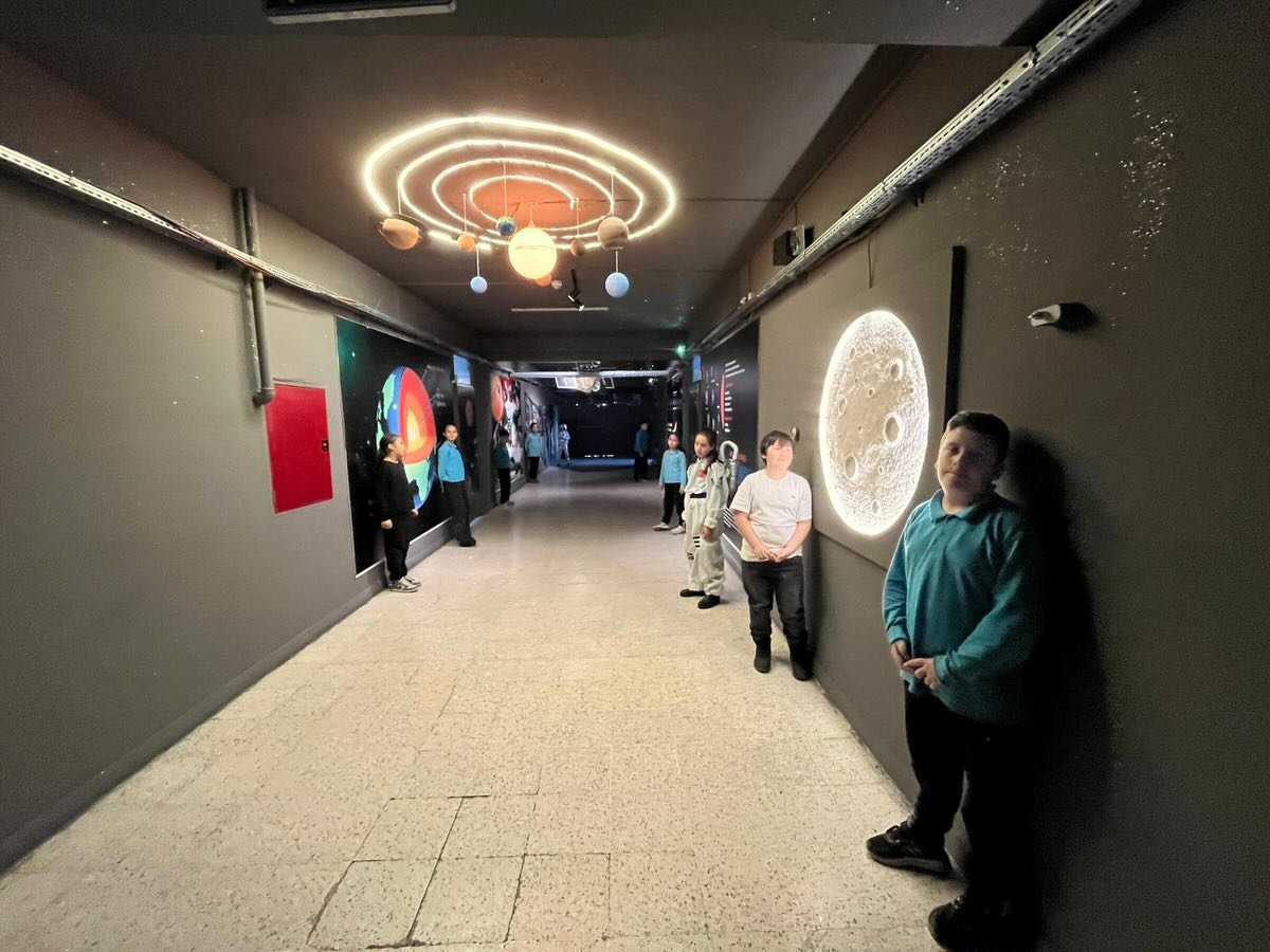 Koridorda yer alan: Gezegen modelleri, Uzay görselleri, Bilgilendirici panolar sayesinde öğrenciler için hem eğitici hem de görsel açıdan zengin bir öğrenme ortamı oluşturuldu.