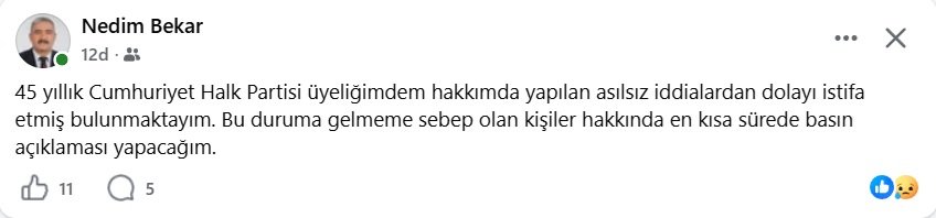Bu nedenlerle, 10 Nisan 2026 tarihi itibarıyla Cumhuriyet Halk Partisi’nden ve Cumhuriyet Halk Partisi Zonguldak İl Genel Meclisi Üyeliği’nden istifa etmiş bulunuyorum.