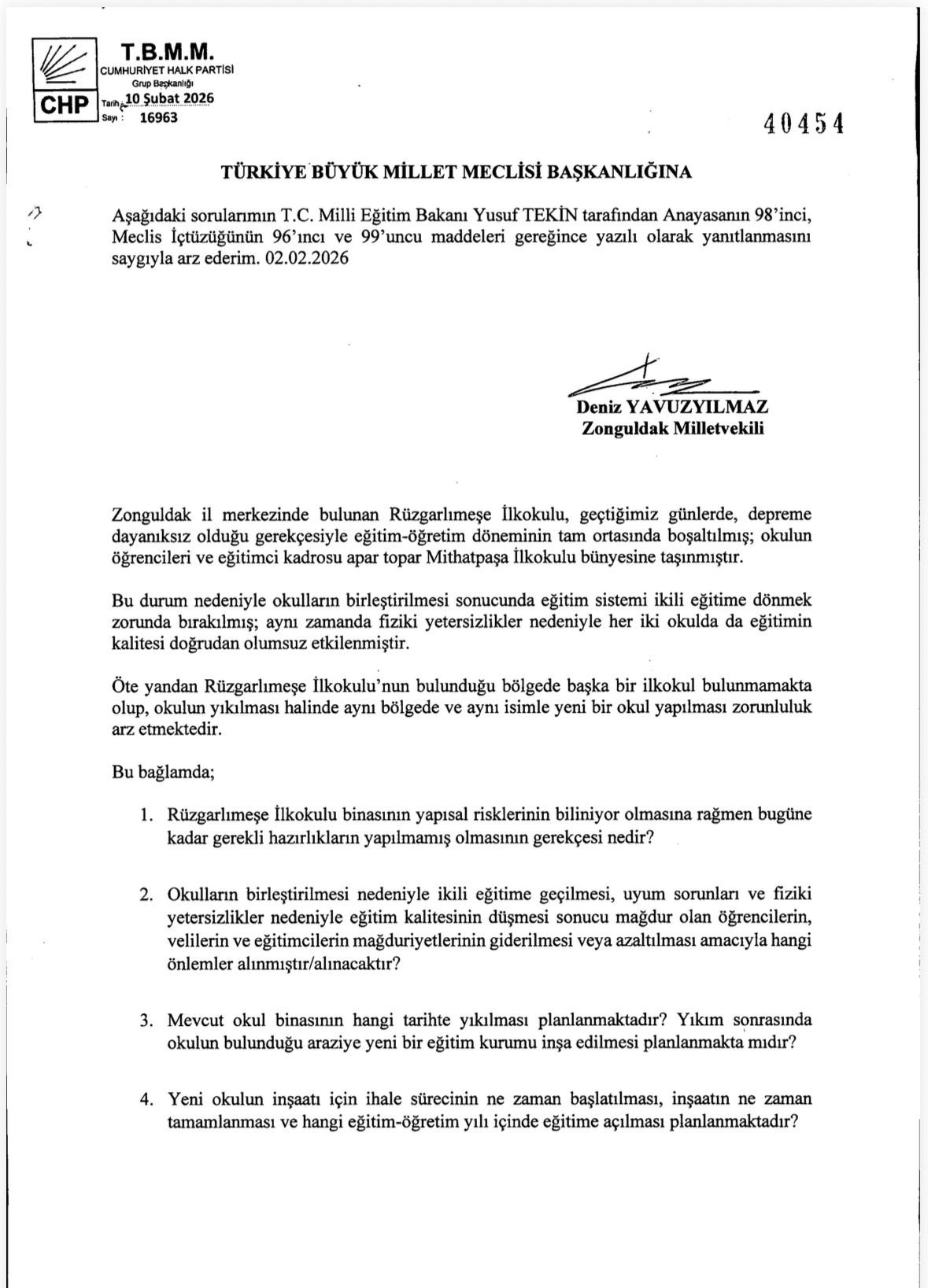 CHP Genel Başkan Yardımcısı ve Zonguldak Milletvekili Deniz Yavuzyılmaz’ın, Zonguldak il merkezinde depreme dayanıksız olduğu gerekçesiyle apar topar boşaltılan Rüzgarlımeşe İlköğretim Okulu’nun akıbetine ilişkin verdiği soru önergesi yanıtlandı. Yavuzyılmaz’ın önergesine yanıt veren Milli Eğitim Bakanlığı, mevcut okul binasının yıkılacağını ve aynı bölgede Rüzgarlımeşe İlkokulu’nun yeniden inşa edileceğini açıkladı.