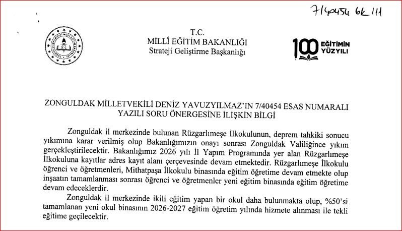Bakanlık tarafından verilen yanıtta, okulun Zonguldak 2026 yılı yapım programında yer aldığı, kayıt almaya devam edeceği ve yeni binanın tamamlanmasının ardından öğrencileri ve eğitimci kadrosuyla birlikte yeniden kendi binasında eğitim faaliyetlerini sürdüreceği bilgisi paylaşıldı.