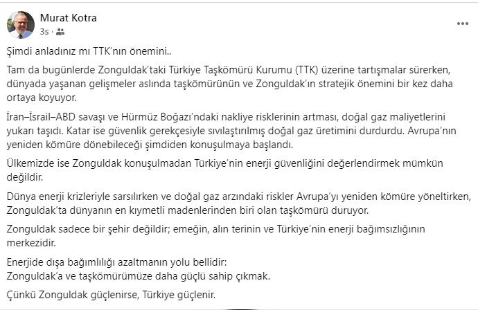 MHP MYK Üyesi Murat Kotra, son dönemde yaşanan küresel gelişmelerin Türkiye Taşkömürü Kurumu ve Zonguldak’taki taşkömürünün stratejik önemini bir kez daha ortaya koyduğunu söyledi.