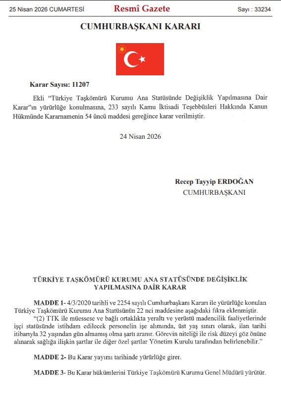 Resmi Gazete’de yayımlanan Cumhurbaşkanı Kararı ile Türkiye Taşkömürü Kurumu (TTK) bünyesinde yapılacak işçi alımlarında önemli bir değişikliğe gidildi. Kararla birlikte, madencilik faaliyetlerinde istihdam edilecek personel için 32 yaş sınırı getirildi.