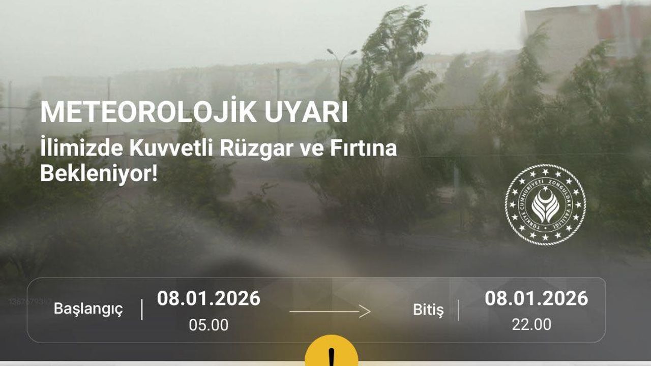Yapılan son meteorolojik değerlendirmelere göre; 8 Ocak Perşembe günü saat 05.00’ten itibaren başlayacak kuvvetli rüzgâr ve fırtınanın, güney ve güneybatı yönlerden eseceği belirtildi. Rüzgâr hızının 50-70 km/saat, yüksek kesimlerde ise yer yer 80-90 km/saat seviyelerine ulaşabileceği ifade edildi. Uyarının aynı gün saat 22.00’ye kadar geçerli olacağı bildirildi.