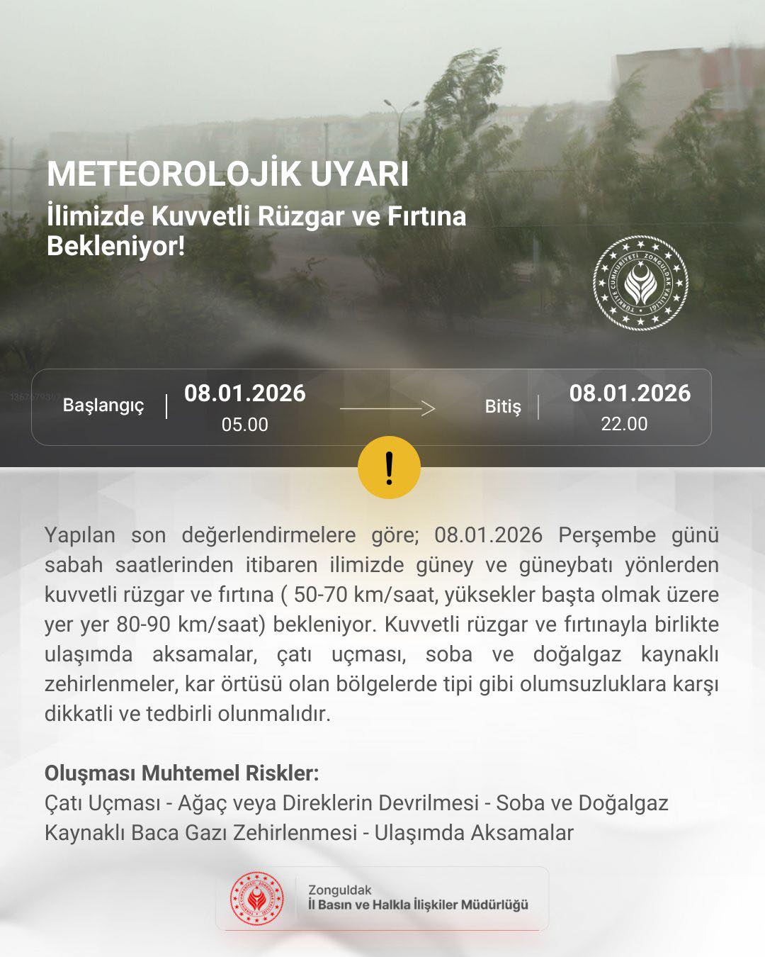 Zonguldak’ta kuvvetli rüzgâr ve fırtına uyarısı yapıldı. Zonguldak Valiliği tarafından yapılan açıklamada, 8 Ocak 2026 Perşembe günü sabah saatlerinden itibaren il genelinde olumsuz hava koşullarının etkili olmasının beklendiği bildirildi.