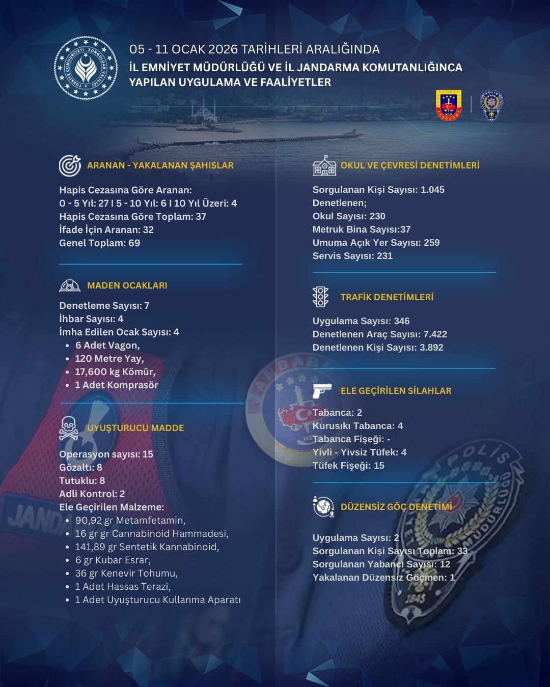 Zonguldak İl Emniyet Müdürlüğü ve İl Jandarma Komutanlığı, 05-11 Ocak 2026 tarihleri arasında önemli bir dizi uygulama gerçekleştirdi. Bu süreçte halkımızın güvenliği ve huzuru için yapılan uygulama ve faaliyetler sonucunda, aranan şahıslar yakalandı, kaçak ocaklar imha edildi, okul ve çevresi denetimleri yapıldı, trafikteki araçlar denetlendi, uyuşturucu madde operasyonları gerçekleştirildi, düzensiz göç ile mücadele edildi.