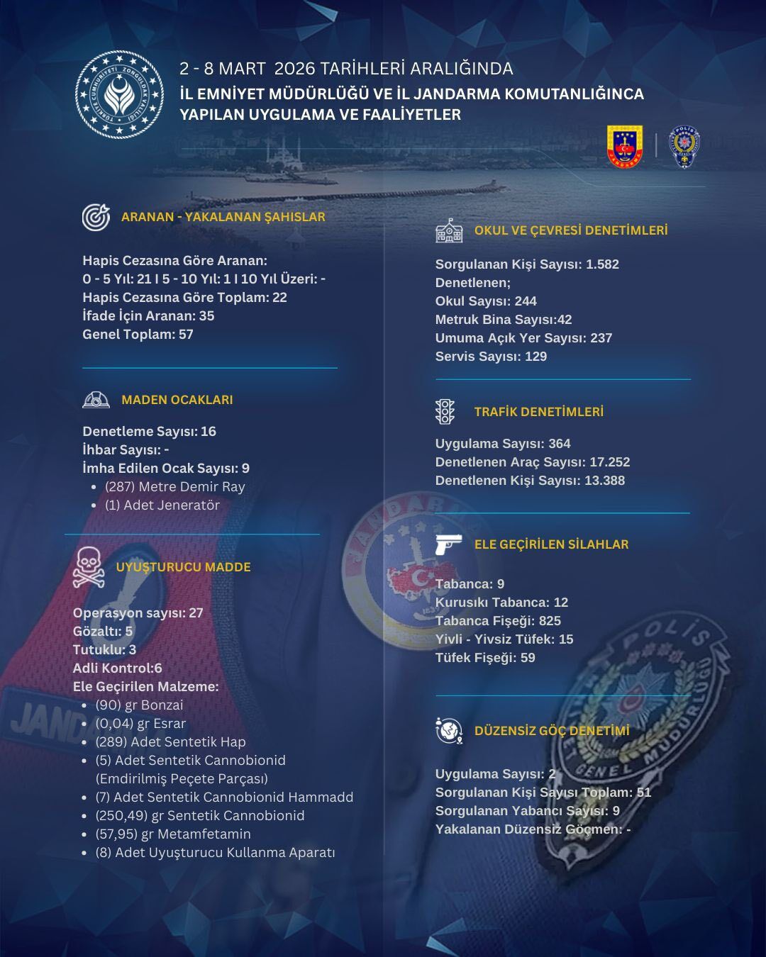 Zonguldak’ta 2–8 Mart 2026 tarihleri arasında İl Emniyet Müdürlüğü ve İl Jandarma Komutanlığı tarafından gerçekleştirilen uygulama ve denetimlerde çok sayıda kişi sorgulanırken, uyuşturucu operasyonları ve silah yakalamaları dikkat çekti.